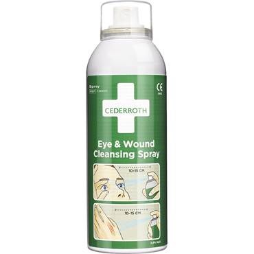 Eye & Wound Cleaning Spray från Cederroth - för att rengöra och skölja bort damm och smuts ur ögon och sår. Sprayen ger ett mjukt vätskeflöde och har en total spoltid på 5 minuter, praktiskt för till exempel skrubbsår som behöver rengöras ordentligt. Sprayen kan användas flera gånger och är steril till sista droppen.