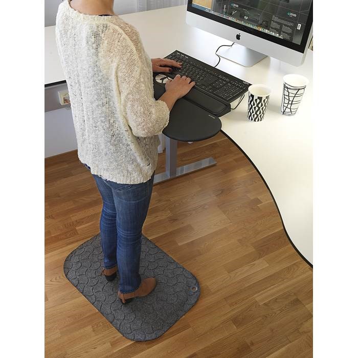 Slipp välja mellan träningsskor på jobbet och att få ont i fötter, ben och rygg när du står upp på jobbet! En smart ergonomisk arbetsplatsmatta som fördelar belastningen i fötterna och benen. Ståmattan är liten och nätt och passar extra bra vid höj- och sänkbara skrivbord, men fungerar lika bra i exempelvis receptioner och butiker där de arbetande redan står mycket.