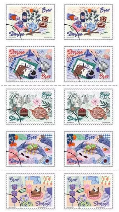 Inrikes frimärken med temat Fika. Självhäftande och kommer på ark med 10 frimärken i 5 olika motiv.