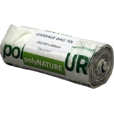 Vita PolyNature säckar/påsar tillverkade av majsstärkelse, biologiskt nedbrytbara. Påsarna går att kompostera utan att påverka miljön.