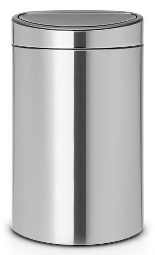 Utrymmeseffektiva papperskorgen Touch Bin från Brabantia, med plattare baksida. Mattborstat rostfritt stål med behandlad yta som ej lämnar kvar några fingeravtryck. Locket öppnas med ett lätt tryck. Innerhink följer med i 40 liters tunnan.