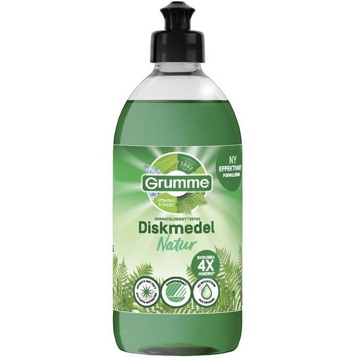 Diska effektivt och miljömärkt med Grumme handdiskmedel som finns i flera härliga dofter. Tar snabbt och effektivt bort tuff och envis smuts och lämnar disken glänsande ren. Tar effektivt tar bort dålig lukt som kommer från fisk, vitlök och matrester, både från din disk och från din disktrasa. Diskmedlet är drygt och effektivt och miljömärkt med Svanen. Innehåller heller inga animaliska ingredienser och är certifierat av Vegan Society. Dermatologiskt testad på känslig hud. Flaskan består av 100% återvunnen plast.
