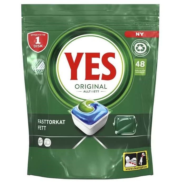 Maskindiskmedel Tabletter YES All in One. Yes Original All in One diskmaskinstabletter är effektiva även mot intorkat fett och ger en skinande ren disk. Yes kombinerar vätska och pulver i en enda kraftfull kapsel. Det ytterst lättlösliga höljet löses upp fort så att kapseln kan börja rengöra och utföra sitt jobb. Och de är så enkla att använda! Ingen uppackning behövs, lägg dem bara i diskmaskinens diskmedelsbehållare.