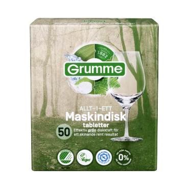 Grumme Maskindisktabletter 50-pack är ett allt-i-ett maskindiskmedel med diskkraft och glansmedel i samma tablett. Den tar effektivt bort fett, fläckar och matrester och ger disken en skinande och fräsch yta.