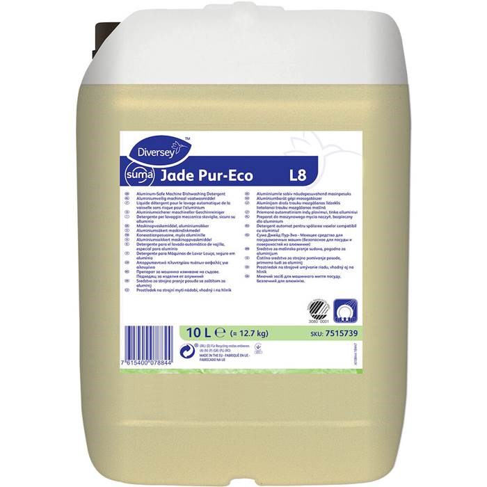 Suma Jade Pur-Eco L8 är ett koncentrerat lågalkaliskt flytande aluminiumsäkert maskindiskmedel som effektivt rengör och löser beläggningar från fett och stärkelserik smuts. Effektivt i alla vattenhårdheter.