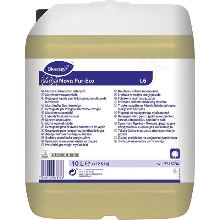 Suma Nova Pur-Eco L6 är ett alkaliskt, koncentrerat, flytande maskindiskmedel som effektivt rengör och löser beläggningar från fett och stärkelse speciellt sammansatt för alla vatten.