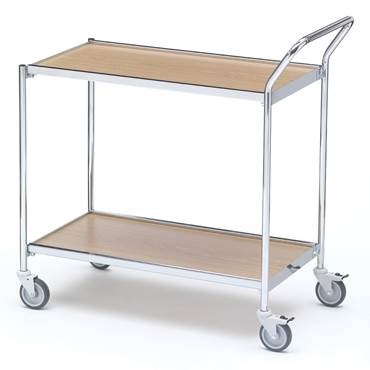 Bordsvagnar - Liten lätt modell passande mindre lager, butiker, serveringar, kontor etc. Vändbara laminatskivor ek/björk. Kromat stativ med 2 eller 3 st hyllor 800 x 420 mm.