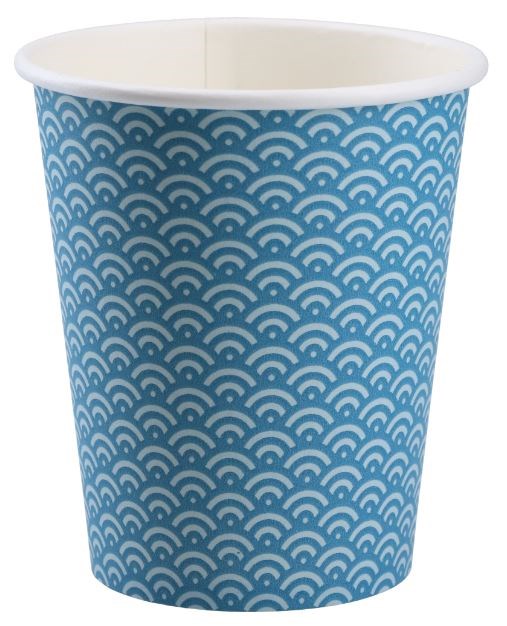 Pappersmugg Wave 23 cl är en blå engångsmugg med dekorativt vågmönster, utformad för att passa både varma och kalla drycker. Den är tillverkad av kartong med PE-beläggning som skyddar mot läckage. Muggen är FSC®-mix märkt, vilket innebär att den kommer från ansvarsfullt skogsbruk – ett bra val för miljömedvetna verksamheter.