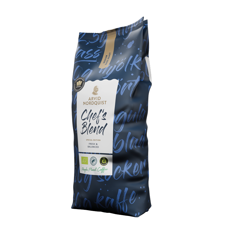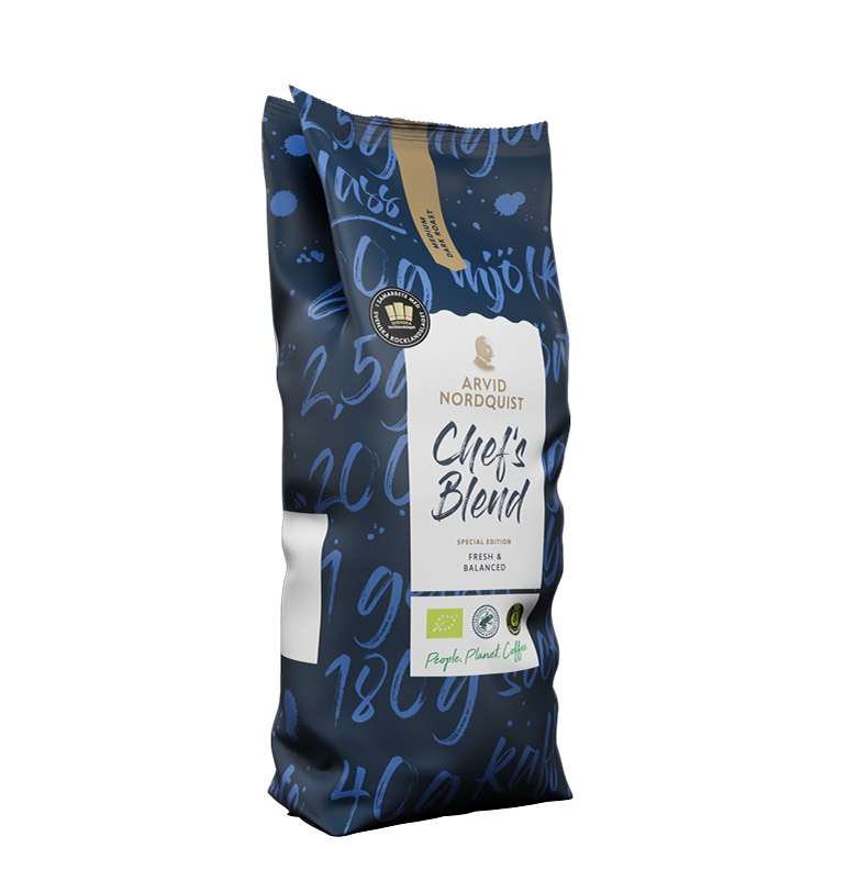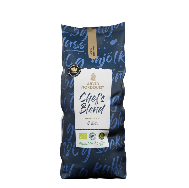 Chef’s Blend Special Edition är speciellt framtagen av Arvid Nordquist tillsammans med Svenska Kocklandslaget, för att du enkelt ska ta ut kaffe på menyn. Arvid Nordquists inköpsteam har valt ut de finaste Arabica-bönorna med stor omsorg och tillsammans med branschens bästa kockar har smakreceptet tagits fram, och bönorna har i sin tur rostats varsamt på vårt fossilfria rosteri i Solna och är naturligtvis 100% klimatkompenserat. Produkten är Rainforest Alliance och EU-ekologiskt certifierat.