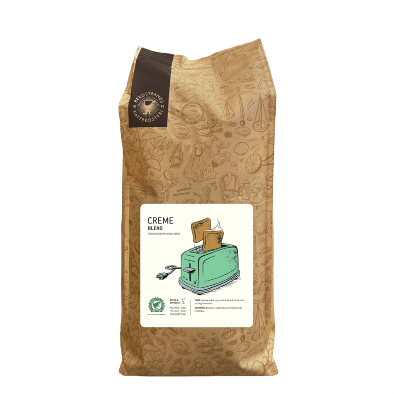 Cremekaffet är en flexibel blandning av bönor från Brasilien, Colombia, Guatemala och Indonesien. Jordig och djup eftersmak med spår av citrus och toner av rostat bröd. Fungerar lika bra svart som med en skvätt mjölk.