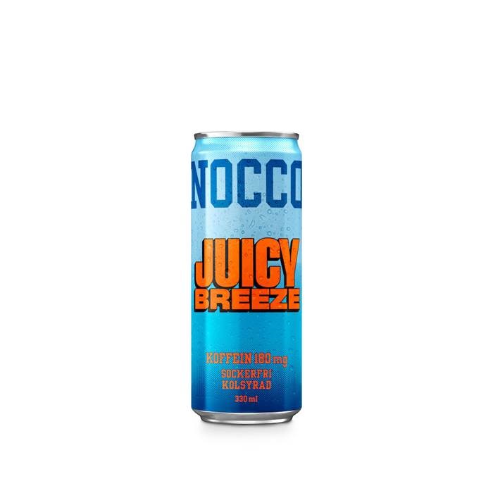 Energidryck Nocco Juicy Breeze. Nocco ger dig den ultimata sommarkänslan genom att lansera den nya limiterade sommarsmaken Nocco Juicy Breeze. Precis som många av dom andra smakerna innehåller den 3000 mg BCAA, 180 mg koffein och är helt fri från socker.