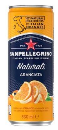 Läsk San Pellegrino Aranciata sleek can. San Pellegrino Aranciata , kolsyrad dryck med juice av apelsiner och apelsiner från Italien. Rik smak av söt solmogen apelsin och finstämd beska.