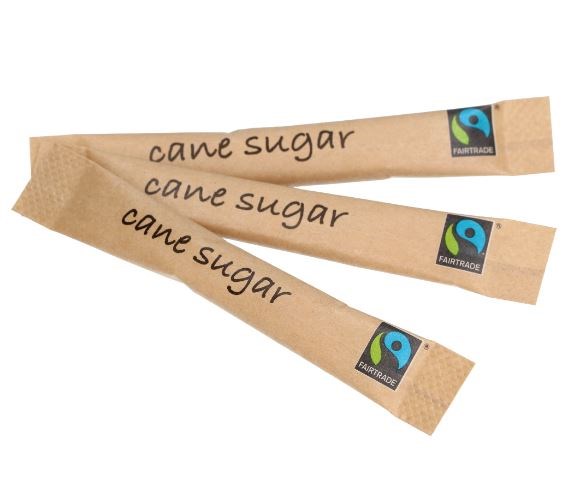 Portionspåsar med brunt socker som är Fair Trade-märkt.