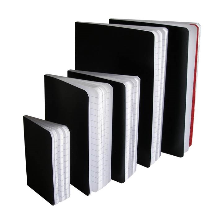 En anteckningsbok med svarta vaxade pärmsidor och A-Ö register samt linjerade blad.