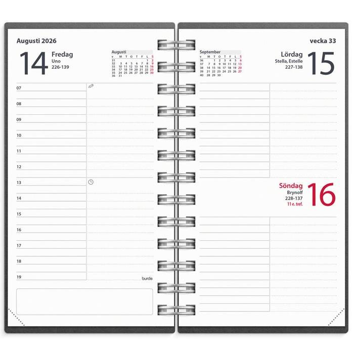 Agenda - En vardag per sida med timindelning 7- 19 och extra skrivutrymme. Innehåller årsplaner för innevarande och följande år.