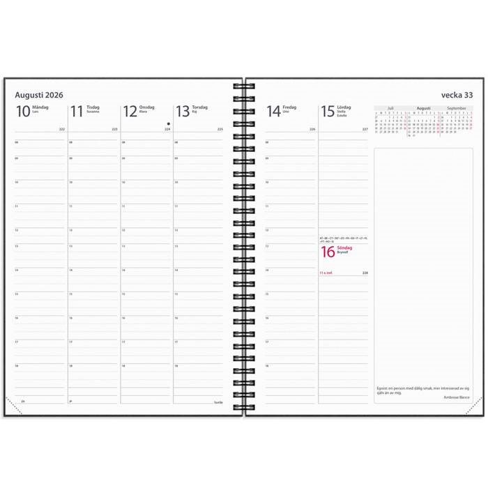 Kalender Business med en vecka per uppslag, timindelad 8-18. Årsplaner för innevarande och följande år. Markeringar för internationella helgdagar.