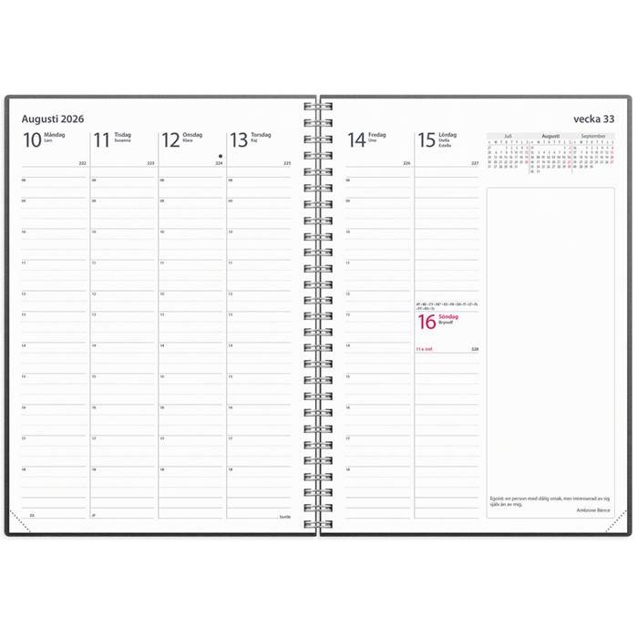 Kalender Business med en vecka per uppslag, timindelad 8-18. Årsplaner för innevarande och följande år. Markeringar för internationella helgdagar.