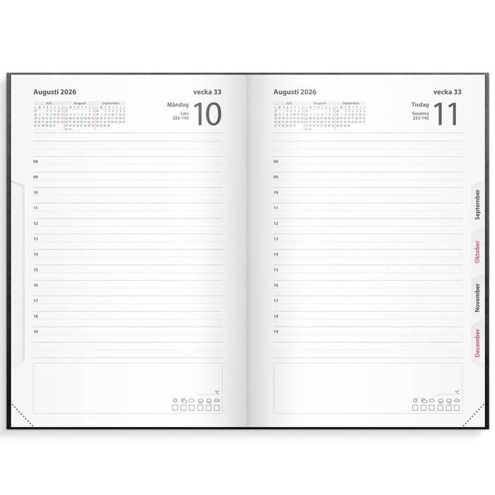 Kalender Dagboken med en dag per sida och timindelad 8-19 ger mycket skrivutrymme per dag och timme.