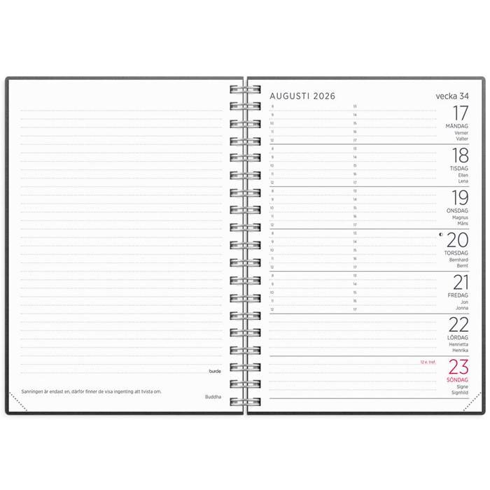 Liten Veckokalender A6 med en vecka per uppslag och mycket anteckningsyta. Hela vänster sida på alla uppslag är linjerade för allt du behöver komma ihåg.