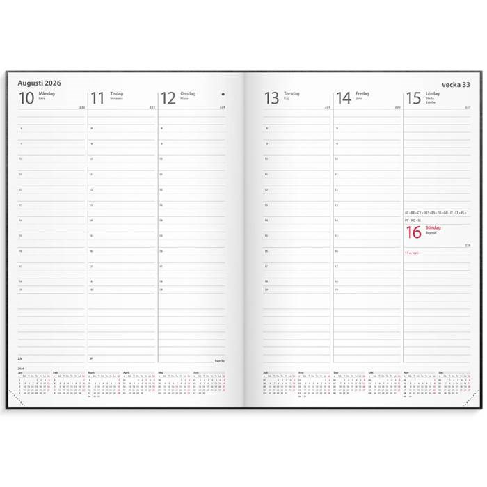 Kalender Weekly A5 med en vecka per uppslag och praktisk årsöversikt för innevarande år längst ner på varje uppslag, timindelad 8-19. Markeringar för internationella helgdagar.