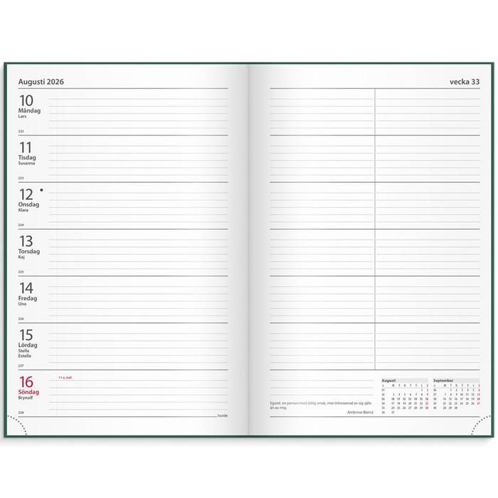 Inbunden kontorskalender med mycket skrivutrymme som sträcker sig över hela uppslaget.