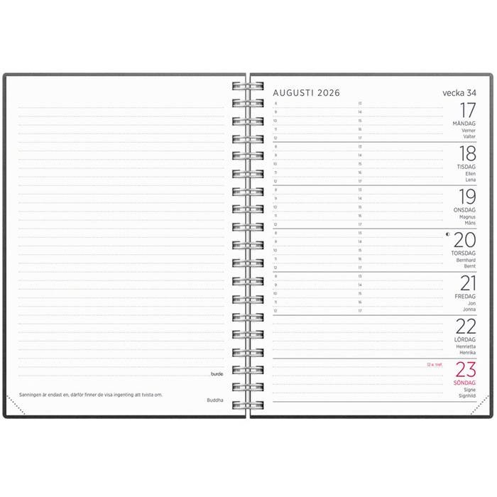 Liten Veckokalender A6 med en vecka per uppslag och mycket anteckningsyta. Hela vänster sida på alla uppslag är linjerade för allt du behöver komma ihåg.