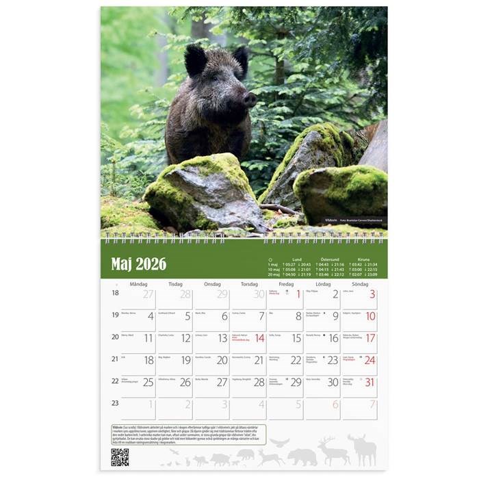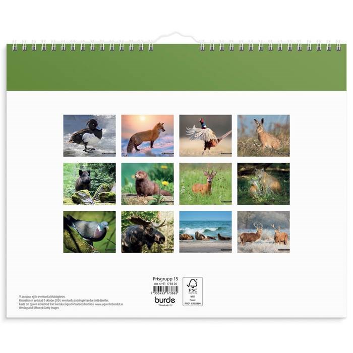 Väggkalender Jaktkalender. Väggkalender med information om när jaktperioder inträffar för olika djur i Sverige via en QR-kod. Soltider för tre horisonter. Vackra bilder på svenska vilda djur. Väggkalender från Burde.