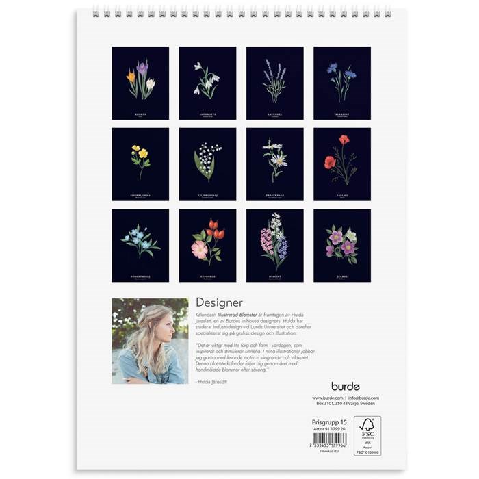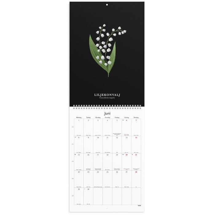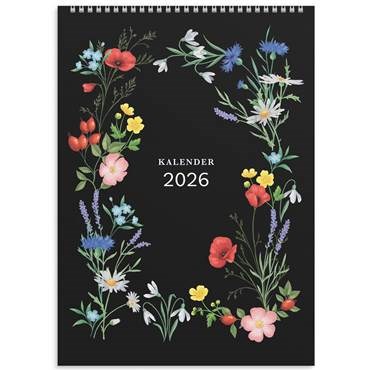 Kalender Illustrerad blomster A4. Väggkalender med illustrationer från naturen. Det vackert illustrerade motivet syns tydligt mot den svarta bakgrunden och blir som en tavla. I månadskalendariet finns möjlighet att anteckna. Väggkalender från Burde.