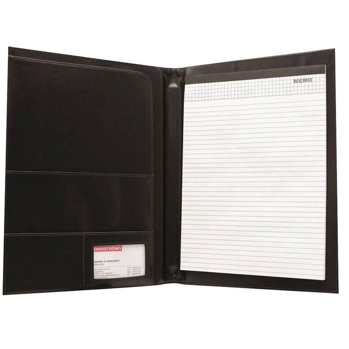 En praktisk och stilfull konferensmapp i svart konstläder. Plats för visitkort etc. Inklusive ett block i A4 med 30 ark.