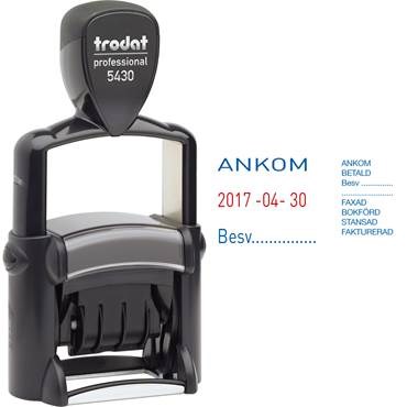 Stämpel Trodat 5430 med datum och utbytbara texter. 4 mm texthöjd. Enkelt att byta den inbyggda dynkassetten. Stativ av metall med datum och utbytbara texter av gummi på nylonväv.