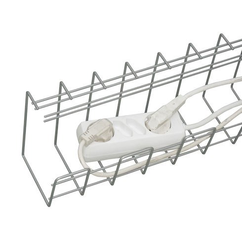 Kabelgömma/-korg i pulverlackerad ståltråd. Mycket enkel att montera under eller vid sidan av skrivbordsskivan. Har gott om plats för kablar och större grendosor.
