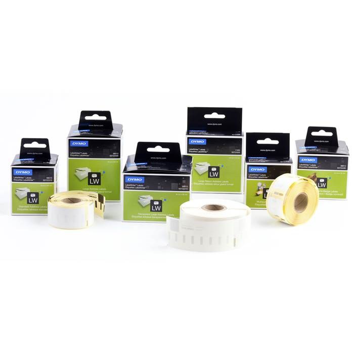 Självhäftande etiketter i löpande bana till Dymo LabelWriter etikettskrivare. Flera olika storlekar för olika användningsområden. Tydliga och läsbara texter.